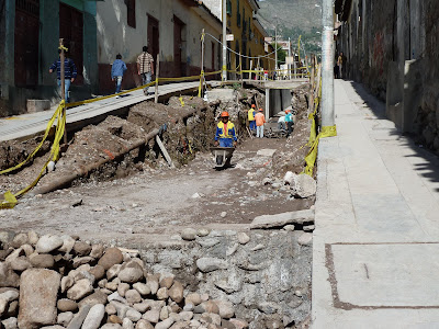 There seems to be distinct demarcations in the process of constructing a major drain. Digging a massive trench down the middle of the road could be seen as a starting point. With the use of large wooden panels the sides and base of the drain are set in place and the concrete is poured.